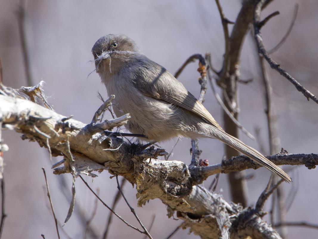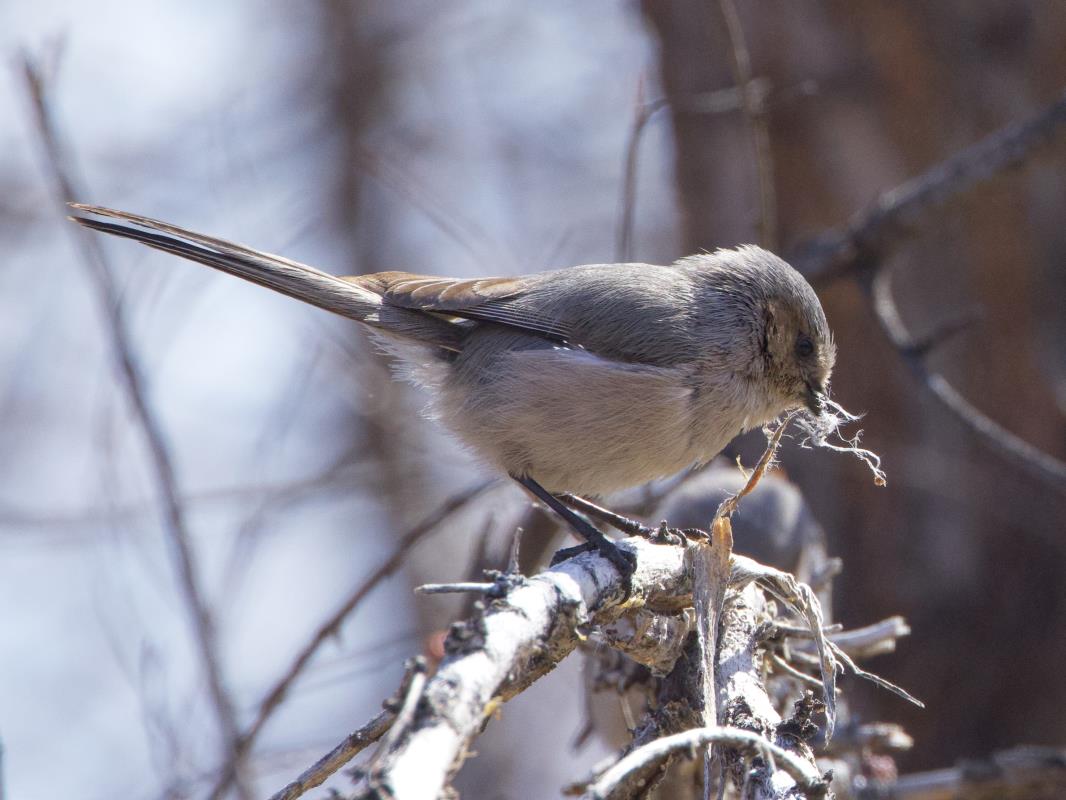 Female Bushtit gathering nesting materials